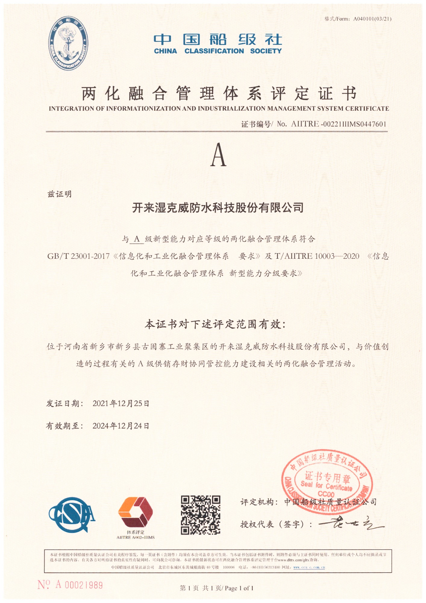 兩化融合管理體系評(píng)定證書