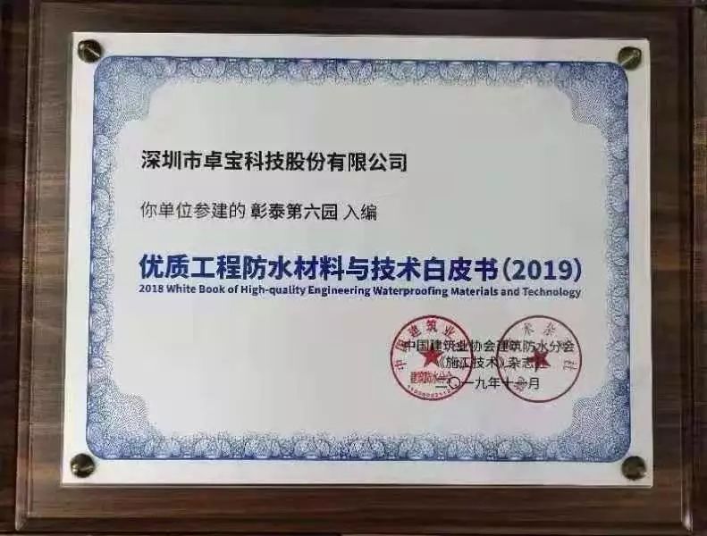 據悉,《優質工程防水材料與技術白皮書(2019版)》的編撰采取企業自愿申報、協會審核、專家遴選的形式,匯集優質防水工程材料與技術成果。該書作為促進行業技術進步的重要載體,匯集了一批優質防水工程材料與技術成果,此次的入選是對卓寶施工質量的認可。
