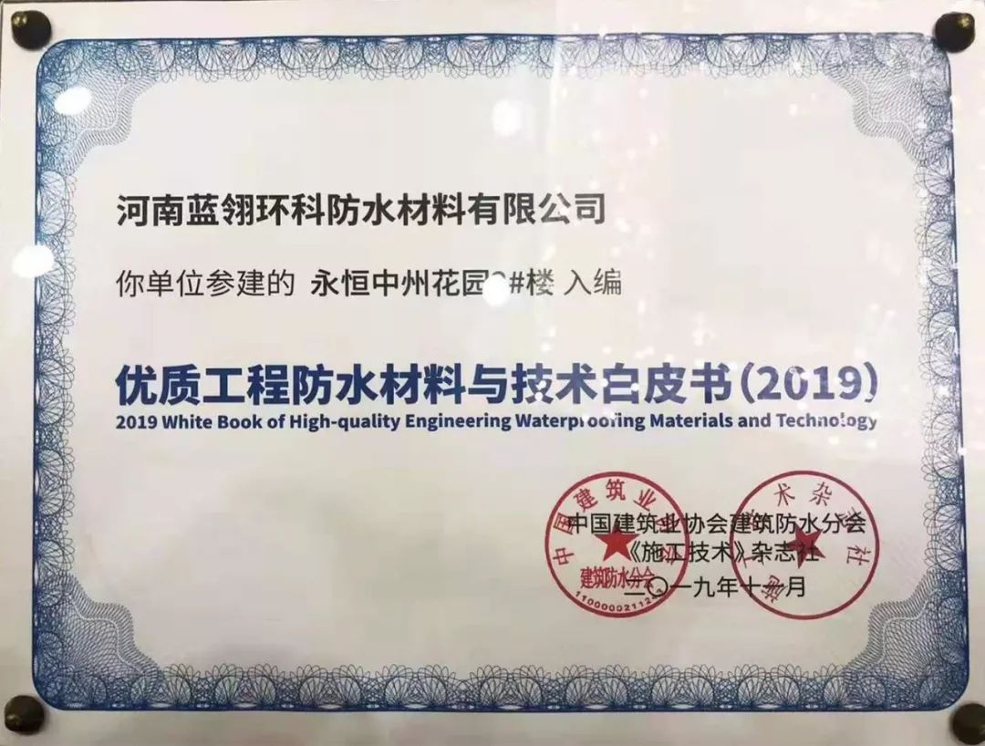 藍翎環科永恒中州花園2#項目入選。再次入選《白皮書》,是對藍翎環科施工質量的認可,能夠進一步推廣藍翎環科優質防水工程材料和技術成果,并將推動企業技術水平快速提升。